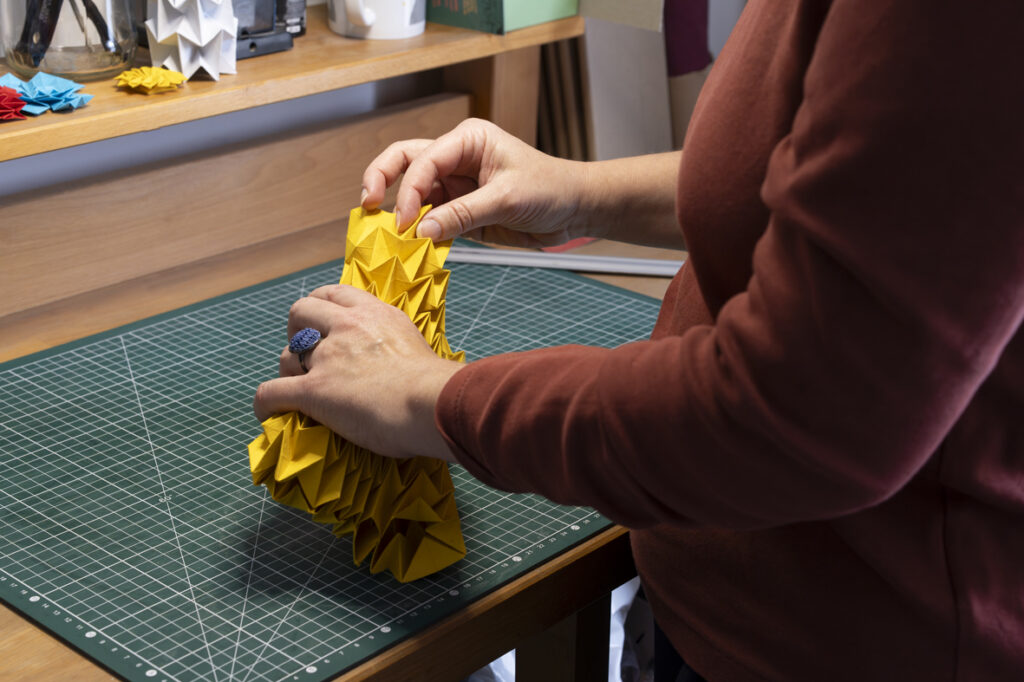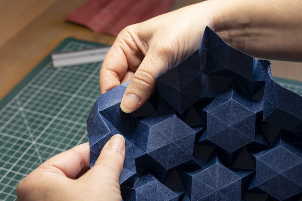 Le pliage est un langage, une structure, un jeu entre ombre et lumière qui transforme le papier en volume, en sculpture, en lumière.